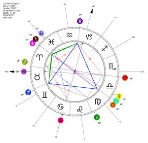 A Lua Nova no último grau de Virgem coincide com um eclipse solar, opondo-se a Saturno e Neptuno, enquanto forma um grande trígono com Urano e Plutão. O “papagaio” reactiva-se, e logo após, o Sol entra em Balança (equinócio), opondo-se exactamente a Neptuno no dia 23, e forma um trígono com Urano e Plutão no dia 24. Marte, ao ingressar em Escorpião no dia 22, fará uma quadratura com Plutão no dia 24, intensificando a necessidade de libertação.